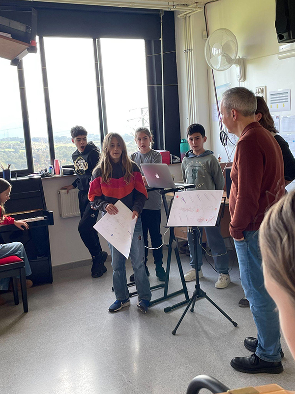 La segona fase, de gener a febrer, es va centrar en la composició: l’alumnat va proposar idees musicals, les va contrastar en assemblea —una dinàmica molt consolidada al centre— i va elaborar una primera versió col·lectiva de la seva pròpia obra, inspirada en els trets de l’obra seleccionada, que va servir com a punt de partida de l’exploració.