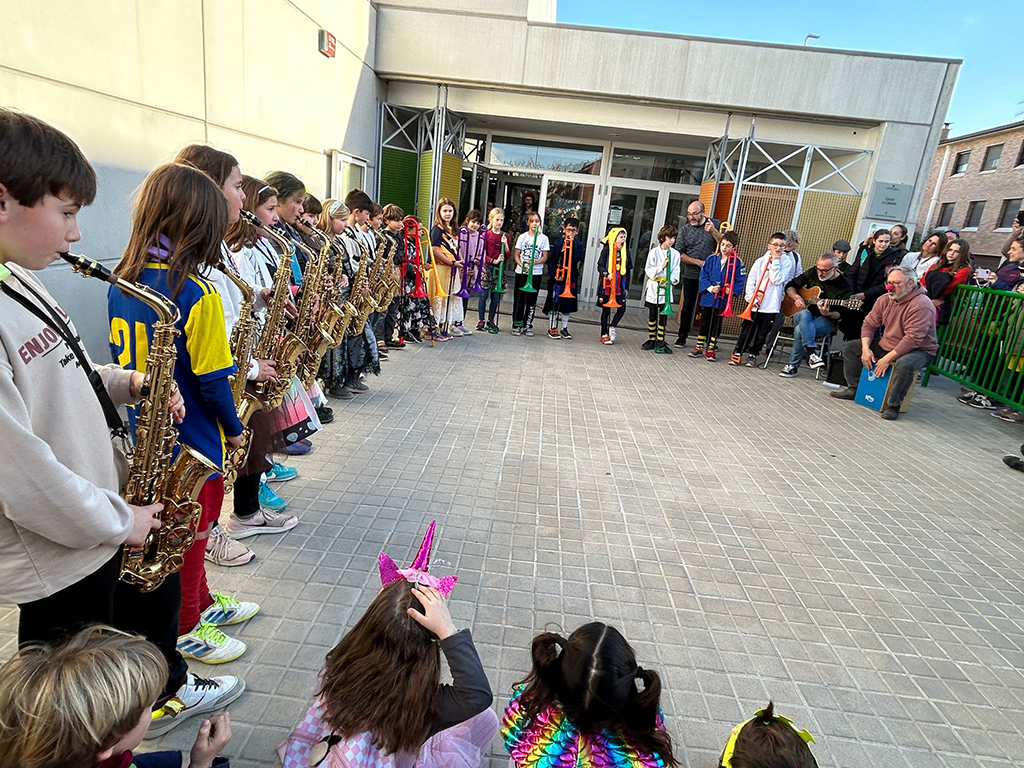 Figura 1. Alumnat del projecte Saxombó en un concert realitzat a la sortida de l’escola durant la setmana de Carnestoltes